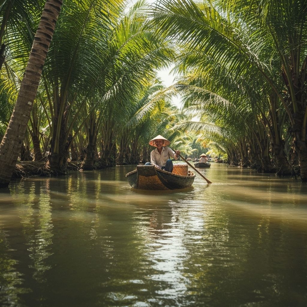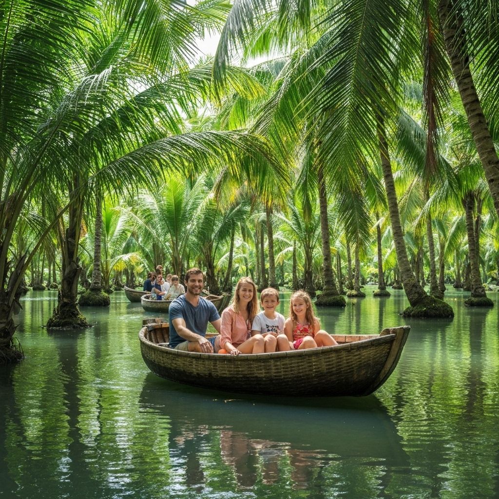 Trải nghiệm độc đáo khi ngồi trên chiếc thuyền thúng tròn, lướt nhẹ qua những con rạch nhỏ giữa rừng dừa xanh mát. Người chèo thuyền sẽ biểu diễn những động tác xoay tròn thuyền đầy nghệ thuật.